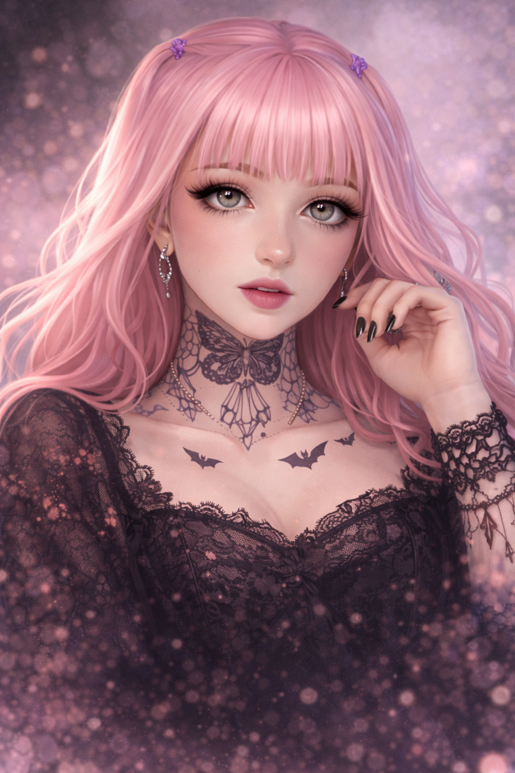 Une série de portraits aux tons roses et violets, inspirée par des poupées modernes et rêveuses.
