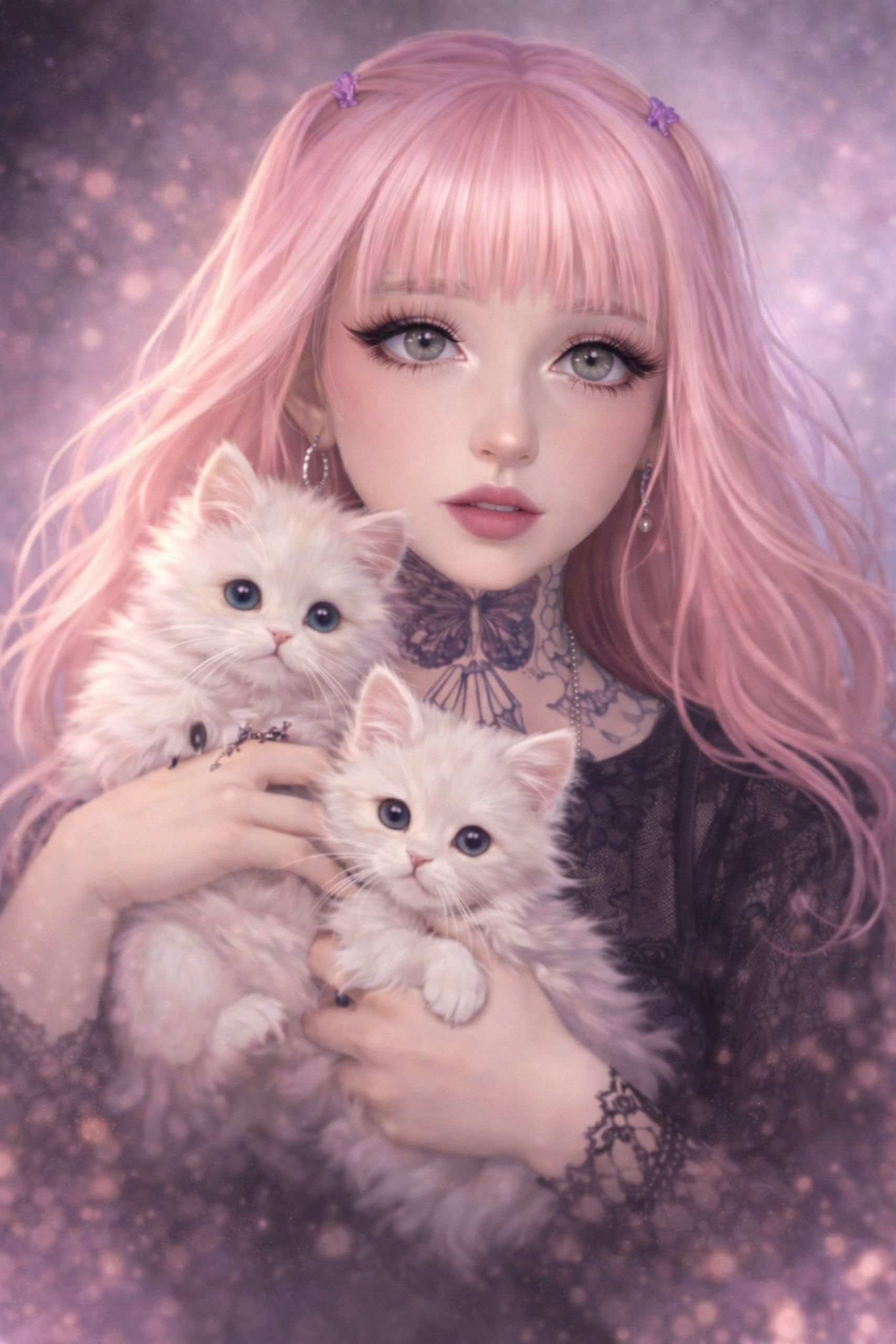 Une série de portraits aux tons roses et violets, inspirée par des poupées modernes et rêveuses.